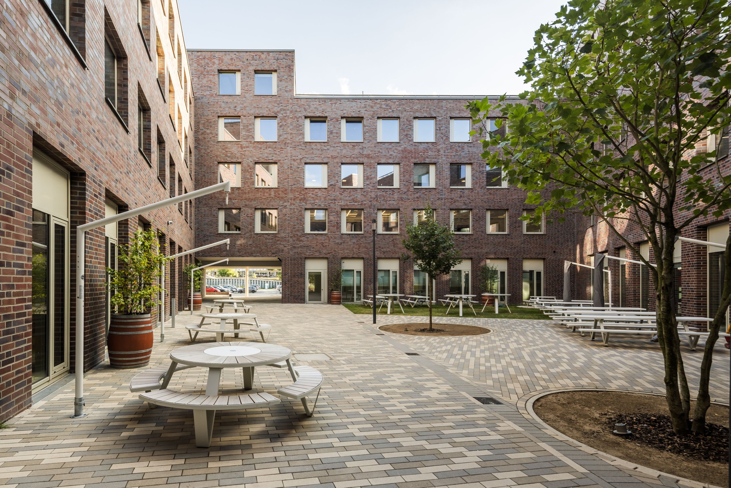 Die Bebauung gliedert sich in zwei Bürohöfe, deren Binnenräume einen ruhigen Aufenthalt im Freien ermöglichen.